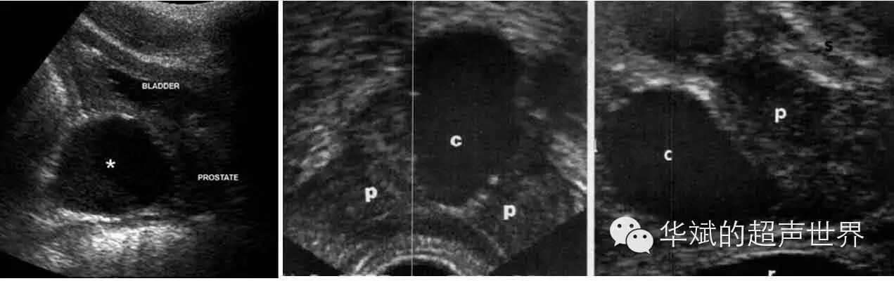 图2 苗勒氏管囊肿。囊肿为中线上,大部位于腺体外。左图;经腹部正中纵断,*:囊肿;中图:经直肠横断,C:囊肿,P:前列腺;右图:经直肠正中矢状断,C:囊肿,P:前列腺。