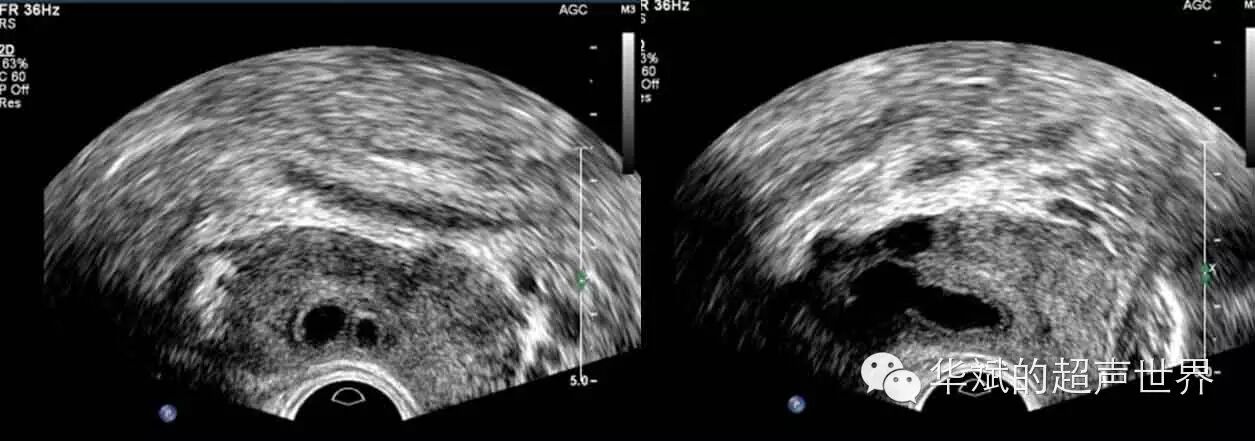 图3 双侧射精管囊肿,左图:经直肠横断。右图:经直肠旁正中矢状断(偏右侧)