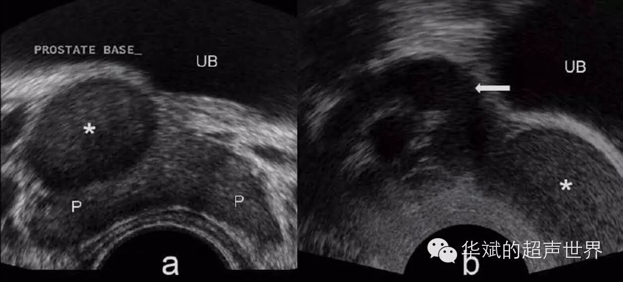 图4 精囊囊肿。右侧精囊区囊肿(星号)位于前列腺与膀胱之间。图a为经直肠横断,图b为精囊长轴扫查,箭头为扩张的精囊。P:前列腺,UB:膀胱。