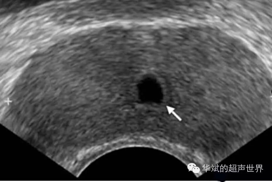 图5 前列腺小囊囊肿。位于中线上,前列腺偏后区域。
