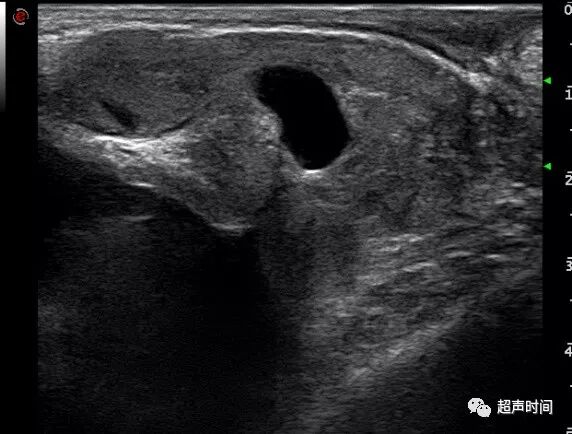 脓肿:多发生于炎症和结核,常发生在青壮年,前列腺增生不明显,囊肿暗区较大,直径 15~30 mm,囊液浑浊,呈低回声,二维超声难与低回声结节鉴别,超声造影可以确诊,并可在超声引导下穿刺引流(图 5)。