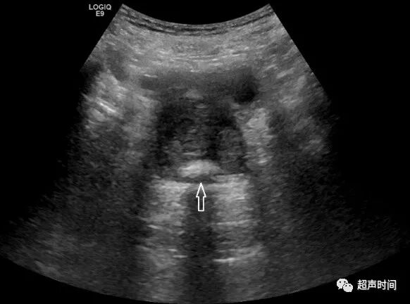 图 1 经腹部超声显示前列腺钙化。患者 80 岁,前列腺体积 54 cm³,中叶突向膀胱,外周带变薄,外科包膜处钙化(箭头示)