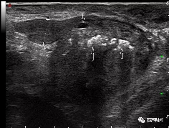 图 4 患者 80 岁,前列腺体积 120 cm³,增生病变区小囊肿(箭头)