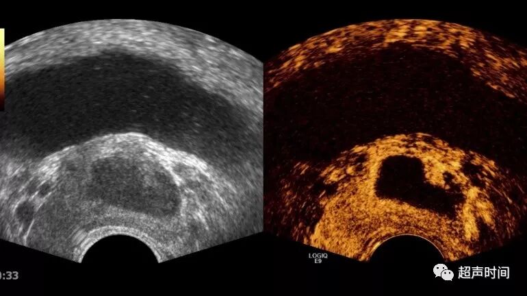 图 5 前列腺脓肿。患者 45 岁,尿频尿痛。前列腺体积30 cm³,前列腺左侧叶内见大块低回声病灶,超声造影无增强